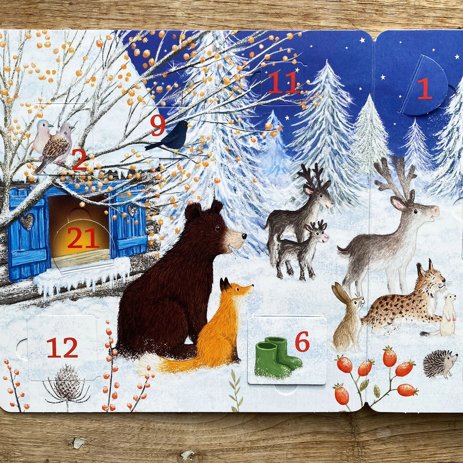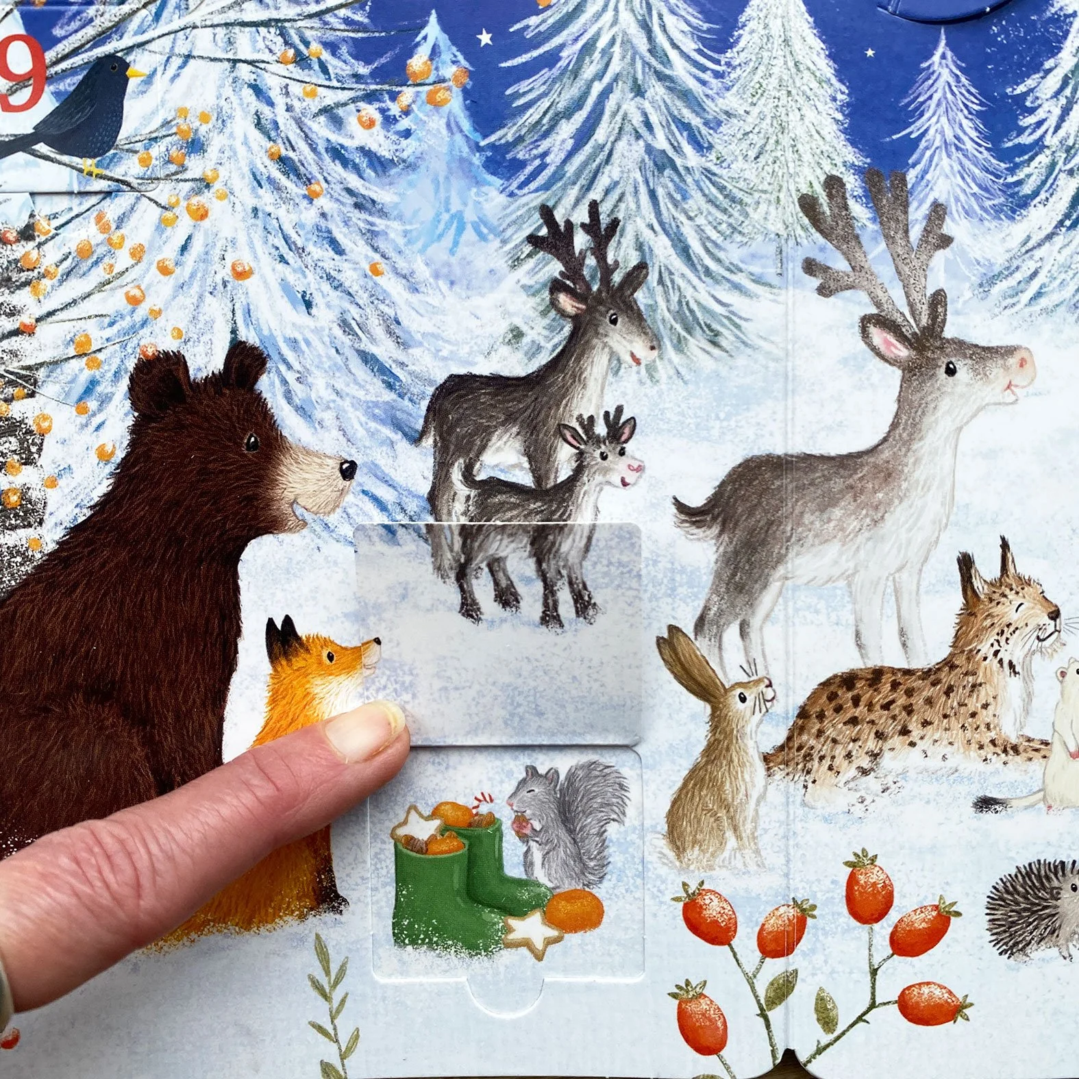 to reveal a festive scene full of advent windows for the little ones to open in the countdown to Christmas